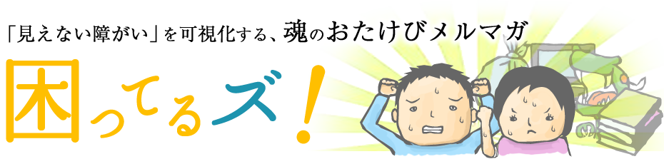 困ってるズ!無料版は、「見えない障害」を抱えている皆さんにご投稿いただいた、「困ってること」「助かっていること」についてのコラムを配 信するメルマガ。言われて気がつく意外な「困ってること」、なるほどと感心する何気ない「助かってること」は、「ぼくも、わたしも、困ってる ズ!?」とお思いになること間違いなし。誰でも無料でお読みいただけます。