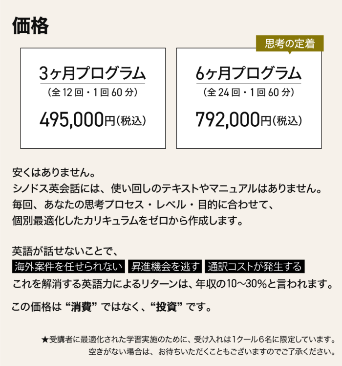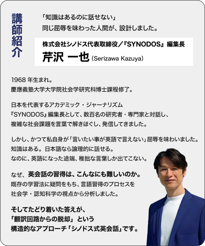※受講を無理に勧めることはありません。※本気の方のみお申し込みください。 ※受講を無理に勧めることはありません。※本気の方のみお申し込みください。 Amazon 紀伊國屋書店 シノドス英会話に関するお問い合わせ、現状診断セッションのお申し込みは下記のフォームよりお願いします。 下記の内容でよろしければ送信ボタンを押してください。 ※送信確認メール、およびご返信はsynodos.jpよりお送りします。@synodos.jpドメインのメールを受信できるようお使いのメーラーをあらかじめご設定ください。 件名 シノドス英会話現状診断セッションお申込み シノドス英会話 に関するお問い合わせ メールアドレス お名前 電話番号 - - お問い合わせ内容 内容を確認する