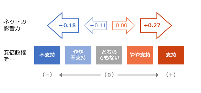矢印のなかの数値は、パソコンでふだんネットを利用している時間の長さが、政権の支持・不支持におよぼす影響力の強さを表している。その数値は、理論的に予測されるとおり、両極にいくほど大きくなっており、「やや支持」を「支持」に変える+0.27と、「やや不支持」を「不支持」に変える-0.18の効果は、統計学的にも意味のある(=誤差の範囲内とみなせない)大きさの数値だ。