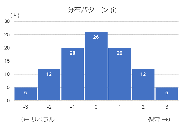まず、保守的だとプラス(+)に、リベラルだとマイナス(-)の値をとるような、政治意識の「ものさし」をつくる。さしあたって仮に、このものさしで測ると、きわめて保守的な人は+3、きわめてリベラルな人は-3になるとしよう。保守でもリベラルでもない穏健派は、真ん中の0である。