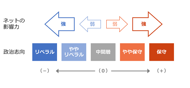 これが「最小」効果説と名づけられたのは、ひとつには、政治に無関心な層に対するネットの影響(効果)はマスメディア以上に弱いと考えられること、そしてもうひとつには、関心層に対しても、保守をリベラルに、リベラルを保守に転向させるような影響力はもたないと考えられることによる。