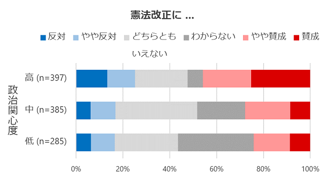 そして、政治関心が高いほど、政治的イシューに対する賛否もより明確になる。音楽好きほど、アーティストに対する評価がはっきり分かれるようなものだ。下の図aは、私が昨年おこなった全国調査から、「ふだんから政治に関心がある」かどうかで分けて、憲法改正に対する賛否の分布を示したものである。政治関心が高いほど、中間部の「どちらともいえない」「わからない」が減り、賛成にせよ反対にせよ両極の回答が増えていることがわかるだろう。